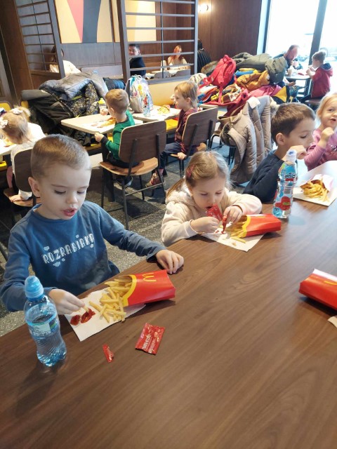 Po dotarciu na salę kinową wszyscy zajęli wygodne miejsca. Podczas projekcji filmu pt. „ Życzenie” panowała cisza, którą przerywały częste śmiechy. Po zakończonym seansie dzieci wraz z opiekunkami udali się do autobusu, który zawiózł wszystkich do restauracji McDonalds. Tam wszyscy najedli się do syta. Wszyscy wrócili pełni uśmiechu i z nadzieją, że już niedługo powtórzymy wycieczkę.
