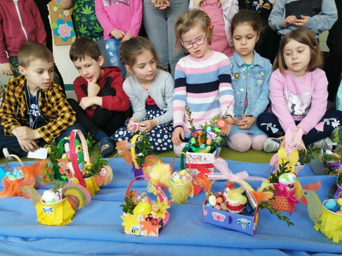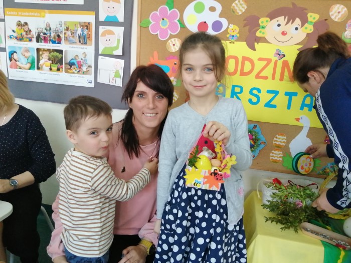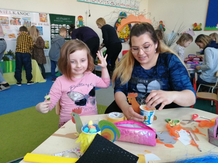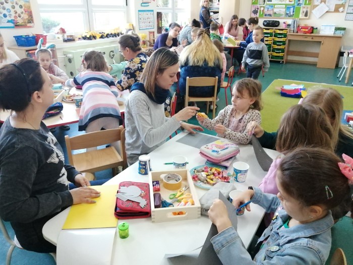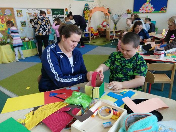 Po raz pierwszy od dłuższego czasu Rodzice mogli uczestniczyć wspólnie z dziećmi w kreatywnych  warsztatach na terenie przedszkola. Zbliżające się Święta Wielkanocne stały się inspiracją do konstruowania wielkanocnych koszyczków. Podstawowym materiałem  do ich stworzenia były tzw. nieużytki. To właśnie z różnych opakowań po produktach powstały wspaniałe koguciki, zajączki oraz radosne koszyczki.  Powodów do radości  było kilka. Po pierwsze wspólne  działanie dzieci z rodzicami, a po drugie wspaniałe efekty tej pracy. Życząc zdrowych i radosnych Świąt Wielkanocnych dziękujemy wszystkim uczestnikom dzisiejszego spotkania.